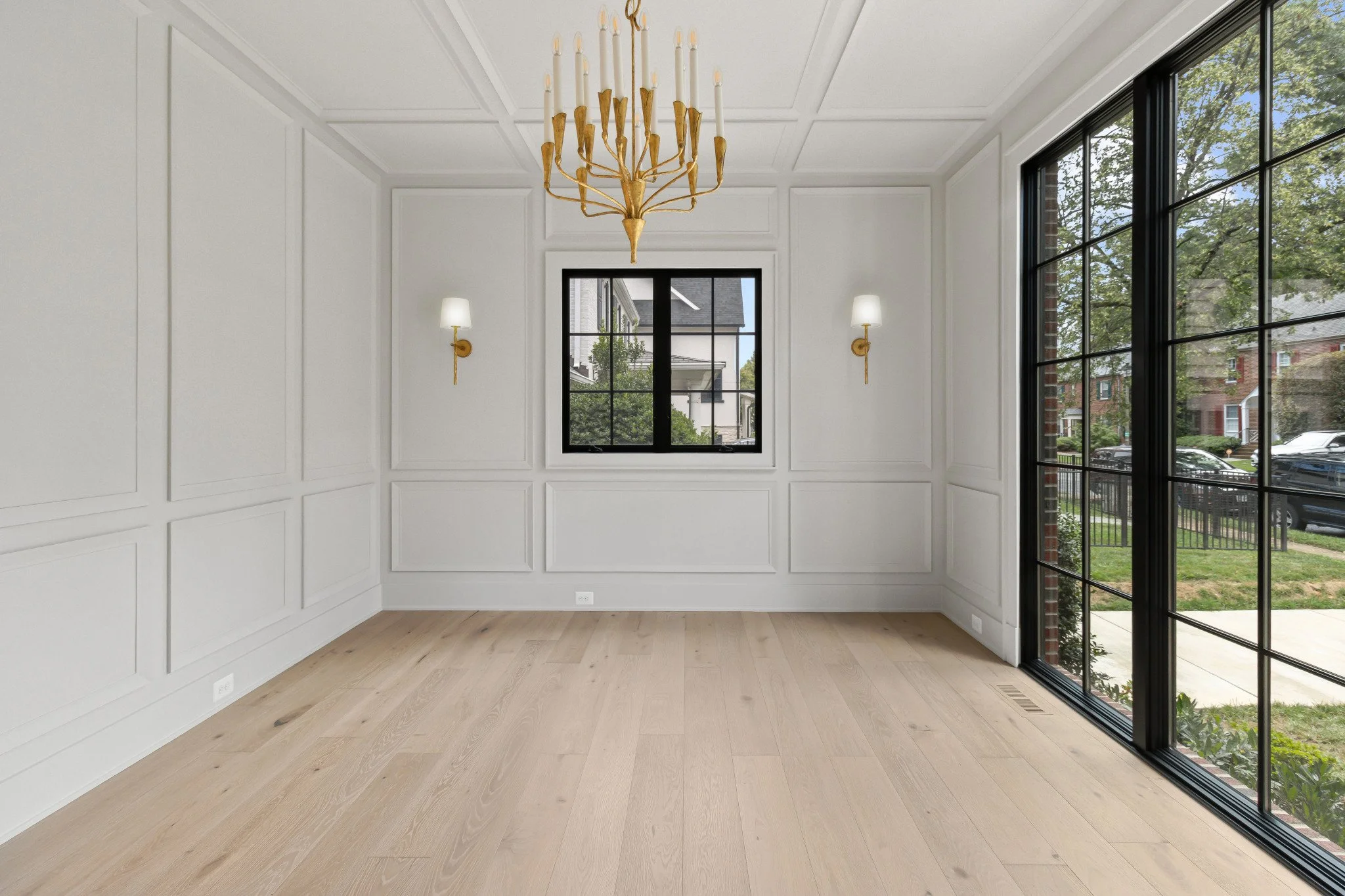 The family room is a true showstopper, featuring a fireplace with a custom wood mantle, flanked by bespoke built-ins and enriched with a beamed ceiling. A telescoping slider door seamlessly connects the family room to the screened porch, creating an ideal space for year-round entertaining. Oversized black-framed windows flood the entire main floor with natural light, enhancing the home’s airy and sophisticated ambiance.